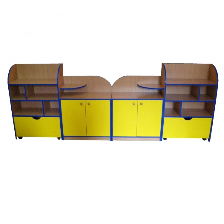 Материал исполнения: ЛДСП 16мм, кромка ПВХ 0.45мм цвет БУК. Цветовое разрешение: Корпус – ЛДСП цвет БУК, Фасады - в сочетании ЗЕЛ, ЖЕЛ, СИН, КРАС, БУК цвета по желанию заказчика.