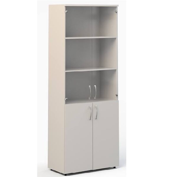 Шкаф состоит из двух отделений. Верх стеклянные дверца и две полки.Низ дверца и полки из лдсп.